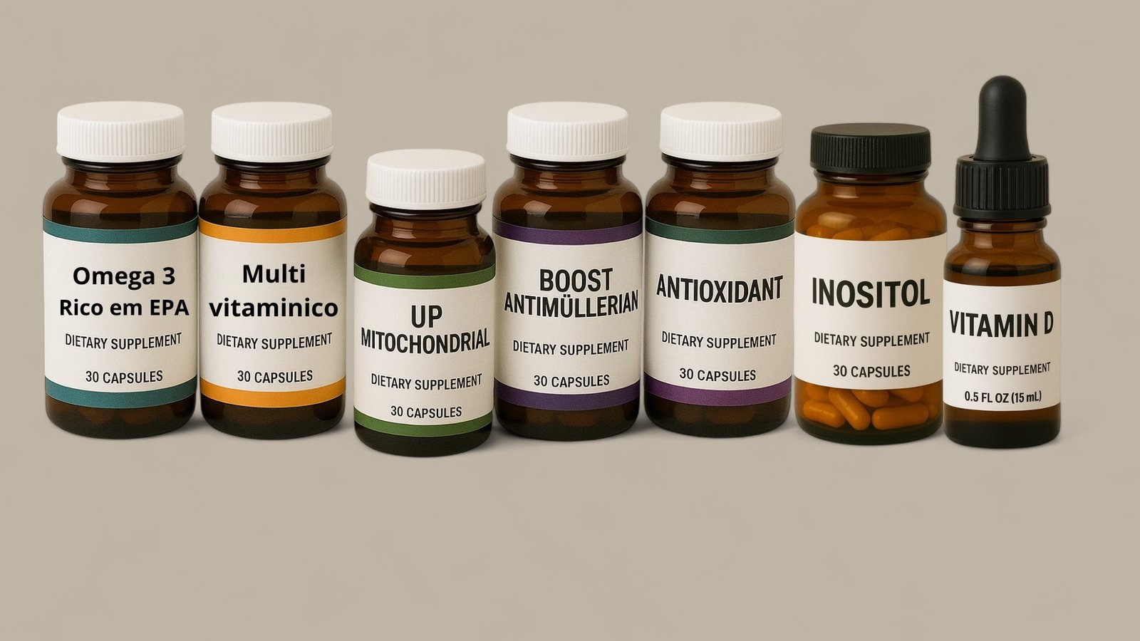 Multivitaminico + Vitamina D oleosa + Ômega 3 Rico em EPA + UP Mitocondrial (em dosagens menores) + Boost Anti Mulleriano + UP Antioxidante + Inositol para Regularizar o Ciclo Menstrual
